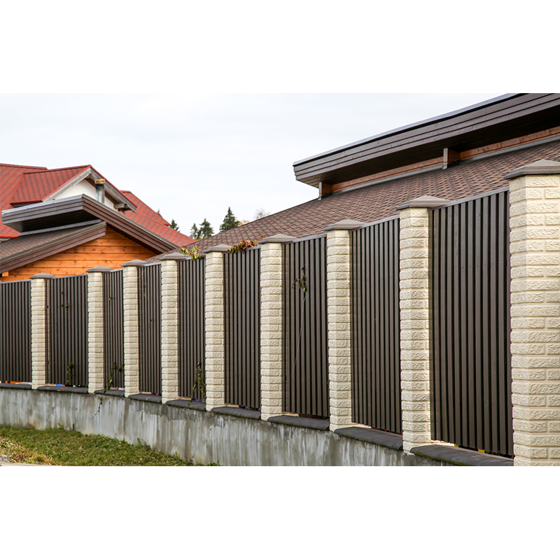 Установка блоков обходится намного дешевле, чем устройство кирпичного забора той же высоты. После монтажа забора блоки окрашиваются фасадной краской по бетону в цвет, который более всего подходит вашему дому.