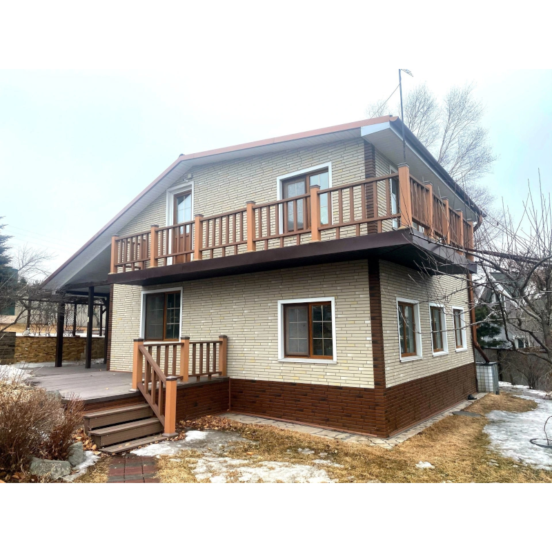 Фасадные панели могут использоваться как для оформления фасада целиком, так и для облицовки фундамента, выделения отдельных деталей.