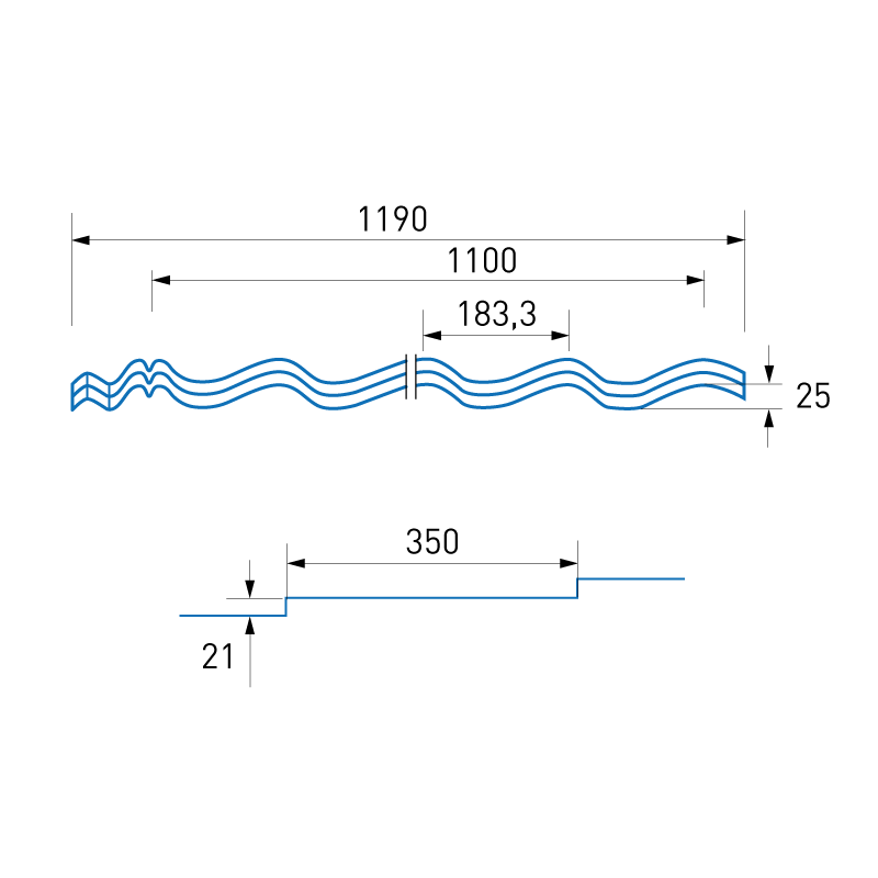 Для изготовления основы применяется металл толщиной 0,5 мм. Покрытие — Полиэстер (PE) цвета RAL7024. Формат поставки: в листах, стандартные длины. Длина — 1170 мм. Профиль — Бегущая волна высотой 46 мм.