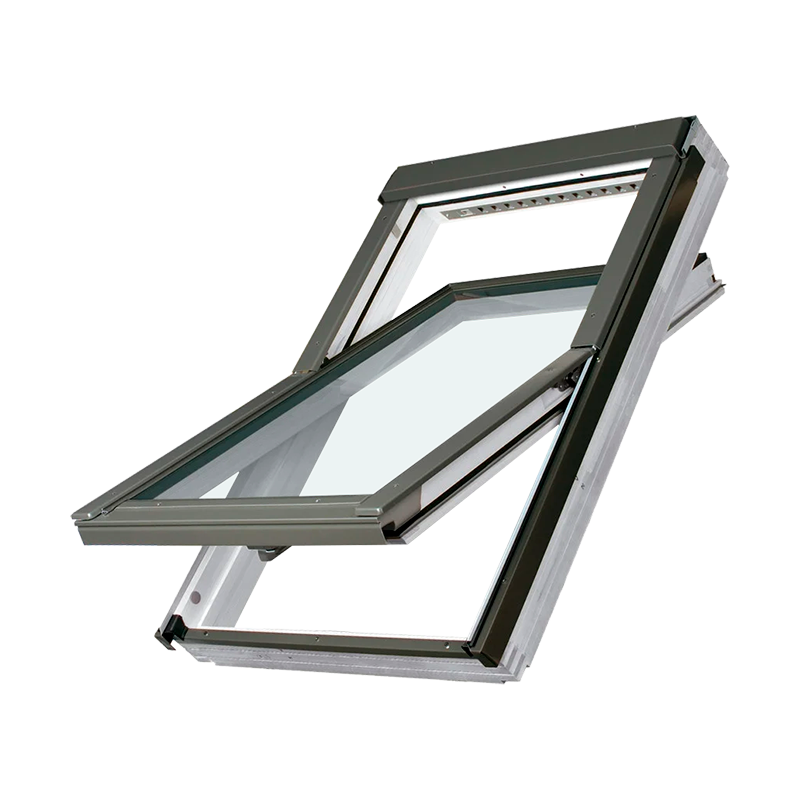 Мансардное окно FAKRO FTU-V U3 со среднеповоротным открыванием, оснащено фрикционными петлями, располагающимися в его центральной части. Такая конструкция позволяет оставлять створку окна в позиции наклона, а также поворачивать её вокруг своей оси на 180°, что значительно облегчает мытье внешнего стекла.