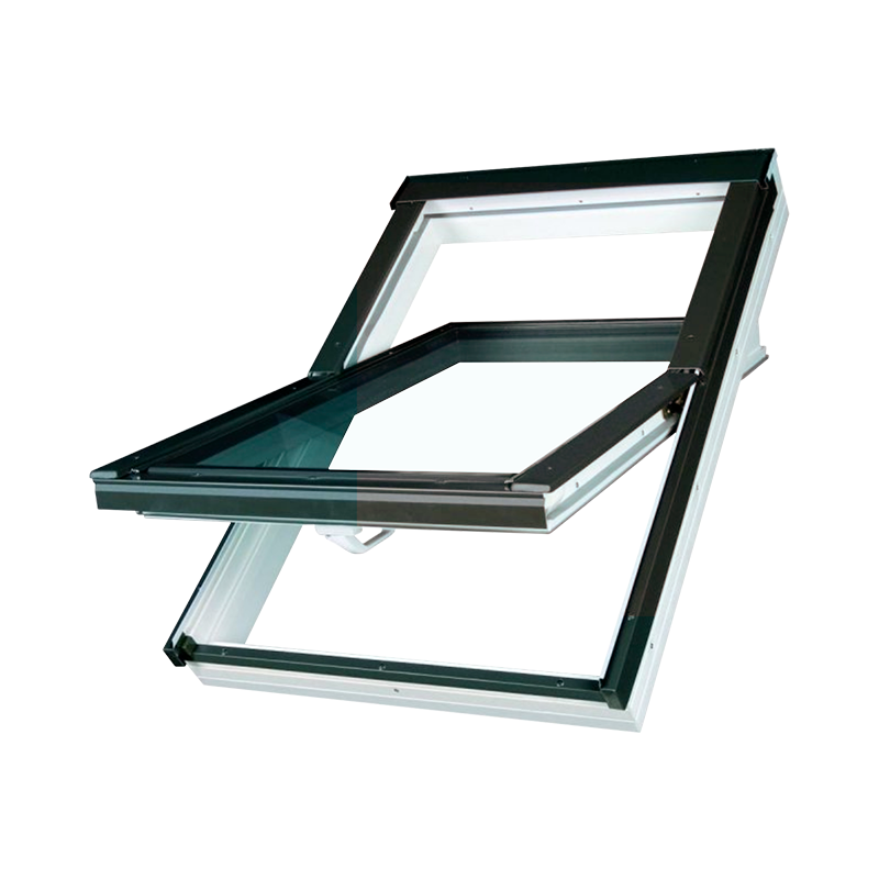 Мансардное окно FAKRO PТР U3 со среднеповоротным открыванием, оснащено фрикционными петлями, располагающимися в его центральной части. Такая конструкция позволяет оставлять створку окна в позиции наклона, а также поворачивать её вокруг своей оси на 180°, что значительно облегчает мытье внешнего стекла.