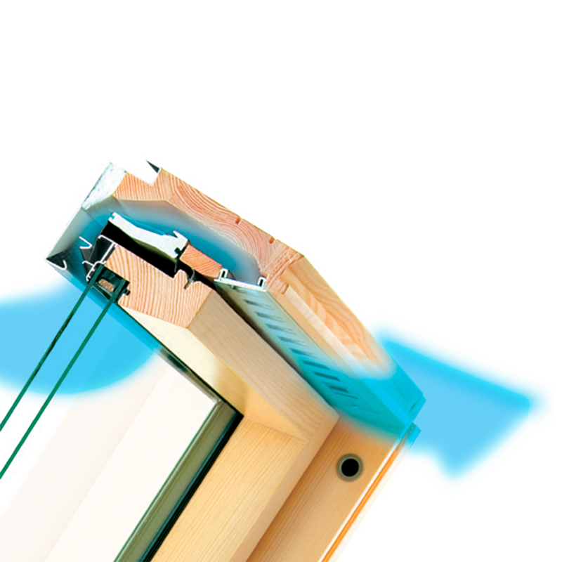 В верхней части оконной рамы установлен автоматический вентклапан V40P, который позволяет оптимизировать приток свежего воздуха в помещение. За счет лабиринтообразного строения клапана перемешивание холодного воздуха, поступающего с улицы, с теплым воздухом происходит внутри вентклапана, что предотвращает образование конденсата на внутренней стороне стеклопакета.