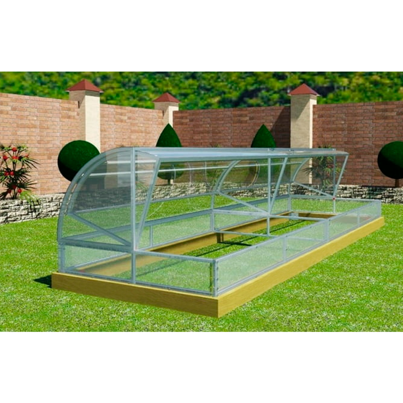 Каркас парника выполнен из оцинкованной профильной трубы сечением 20х20 см. В качестве покрытия использован сотовый поликарбонат толщиной 4 мм. Парник состоит из боковых створок и основания высотой 20 см. Боковые створки, поднятие и опускание которых производится за счет шарнирных элементов, позволяют регулировать микроклимат внутри парника. а также обеспечивают удобный доступ к любой части конструкции. Конструкция имеет 6 продольных стяжек, усиливающих каркас, а также специальный поддерживающий ролик, который исключает провисание верхней створки парника.