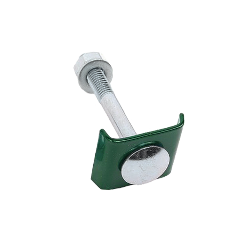 Универсальная оцинкованная скоба с отверстием, один из вариантов крепления сварной сетки к столбу или к другой опоре. Комплектуется болтом и гайкой M6. Загнутые края позволяют надежно зафиксировать сетку к каркасу ограждения. Применяется при монтаже со сверлением опорной конструкции. Скоба окрашена полимерно-порошковым способом в цвет RAL6005 Зеленый мох.