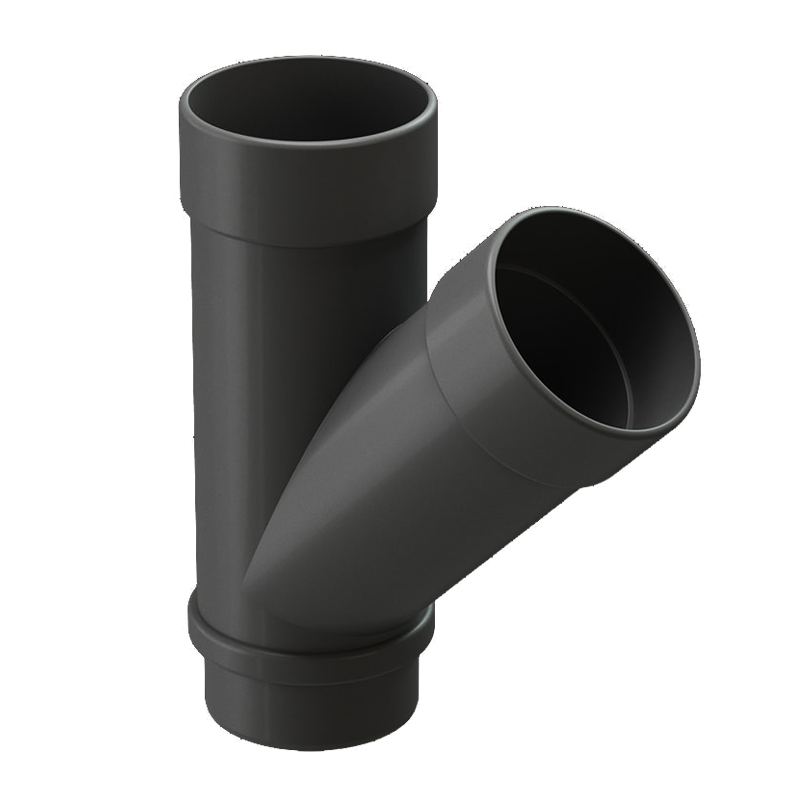 Тройник трубы 45° D100 мм цвета Графит серии LUX от производителя Docke. Применяется для соединения двух водосточных труб в один общий сток.